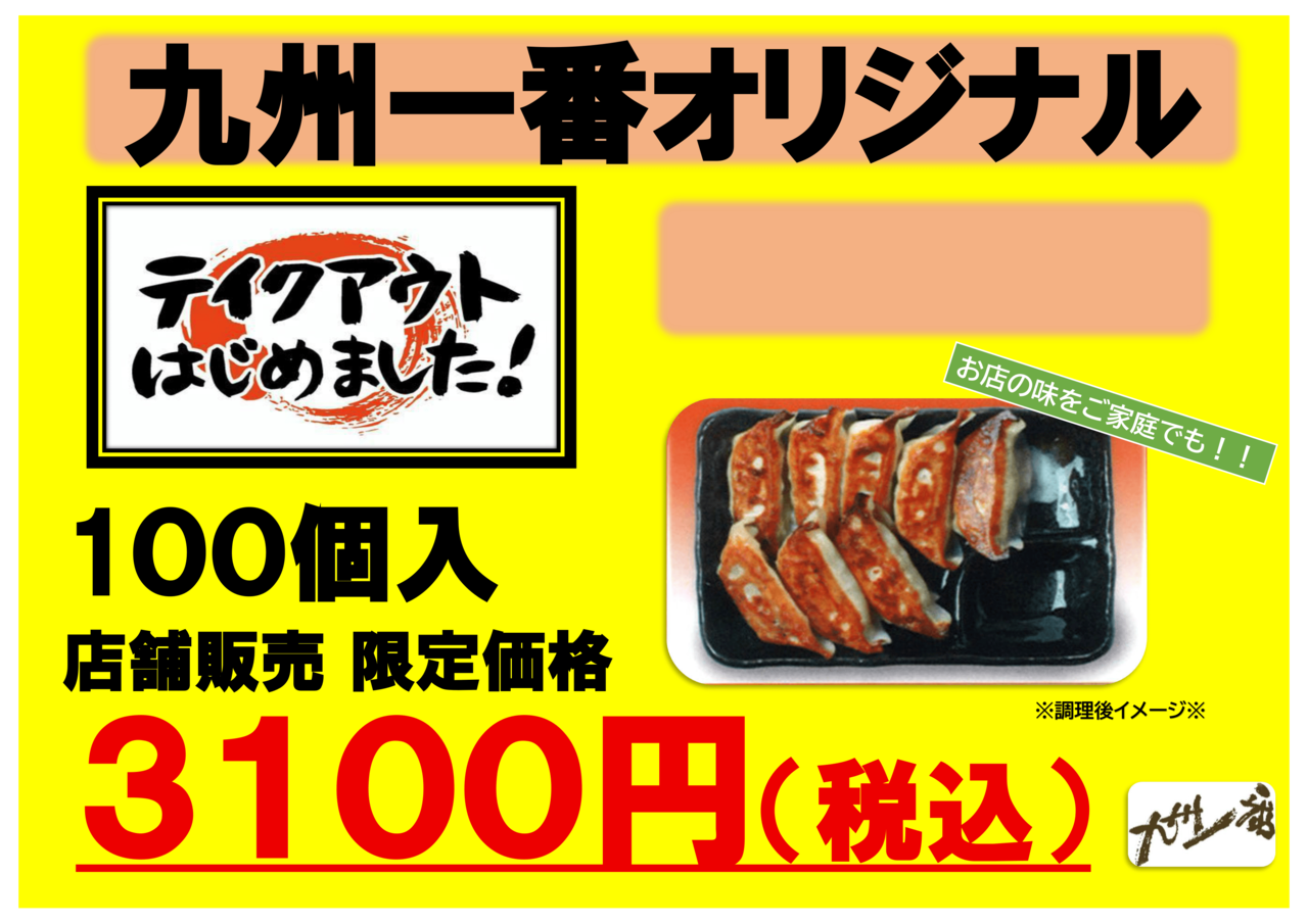 ●九州一番オリジナル冷凍餃子のテイクアウトを始めました。ご来店の際に是非ご利用ください。